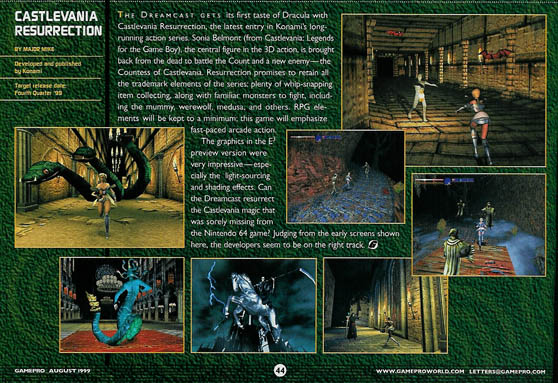 Though critics had largely turned on Castlevania‘s first attempt at 3D gameplay following the release of Legacy of Darkness, Konami was already well into development on a sequel for the SEGA Dreamcast. Castlevania: Resurrection was planned to feature Castlevania: Legends‘ (1997) Sonia Belmont and eschew Symphony of the Night‘s RPG elements in favor of pure arcade action. Unfortunately, due to Konami’s lack of faith in the project after a year in development at their Kobe studio and the Dreamcast’s commercial failure following the release of the PlayStation 2, the project was canceled in 2000. No prototype circulates, though a pre-rendered introductory movie and a full soundtrack are still available online at the time of writing.